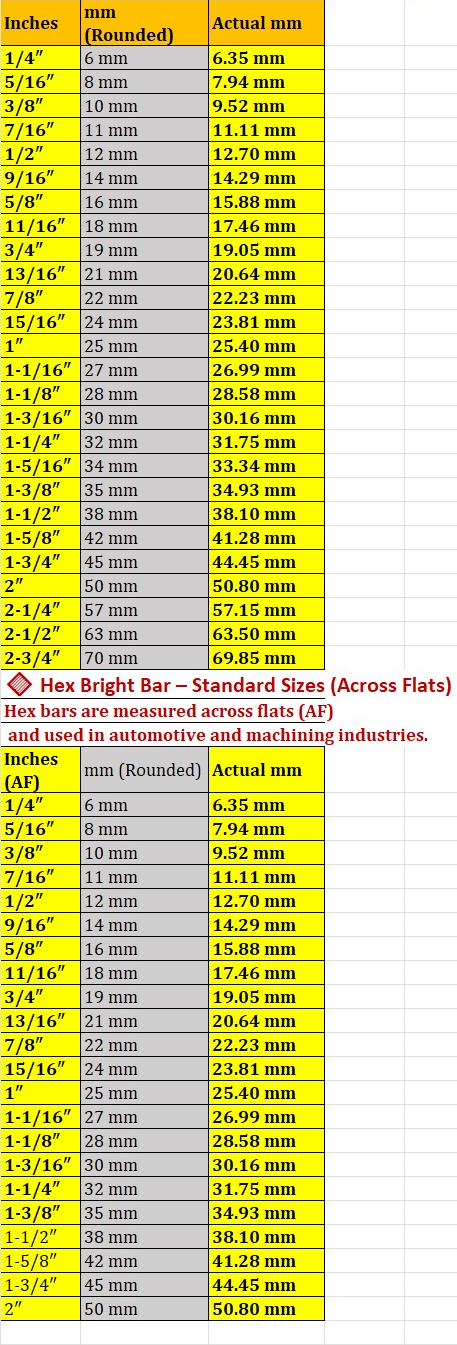 Bright Bar Standard Sizes – Round & Hex (including Inch Equivalent)